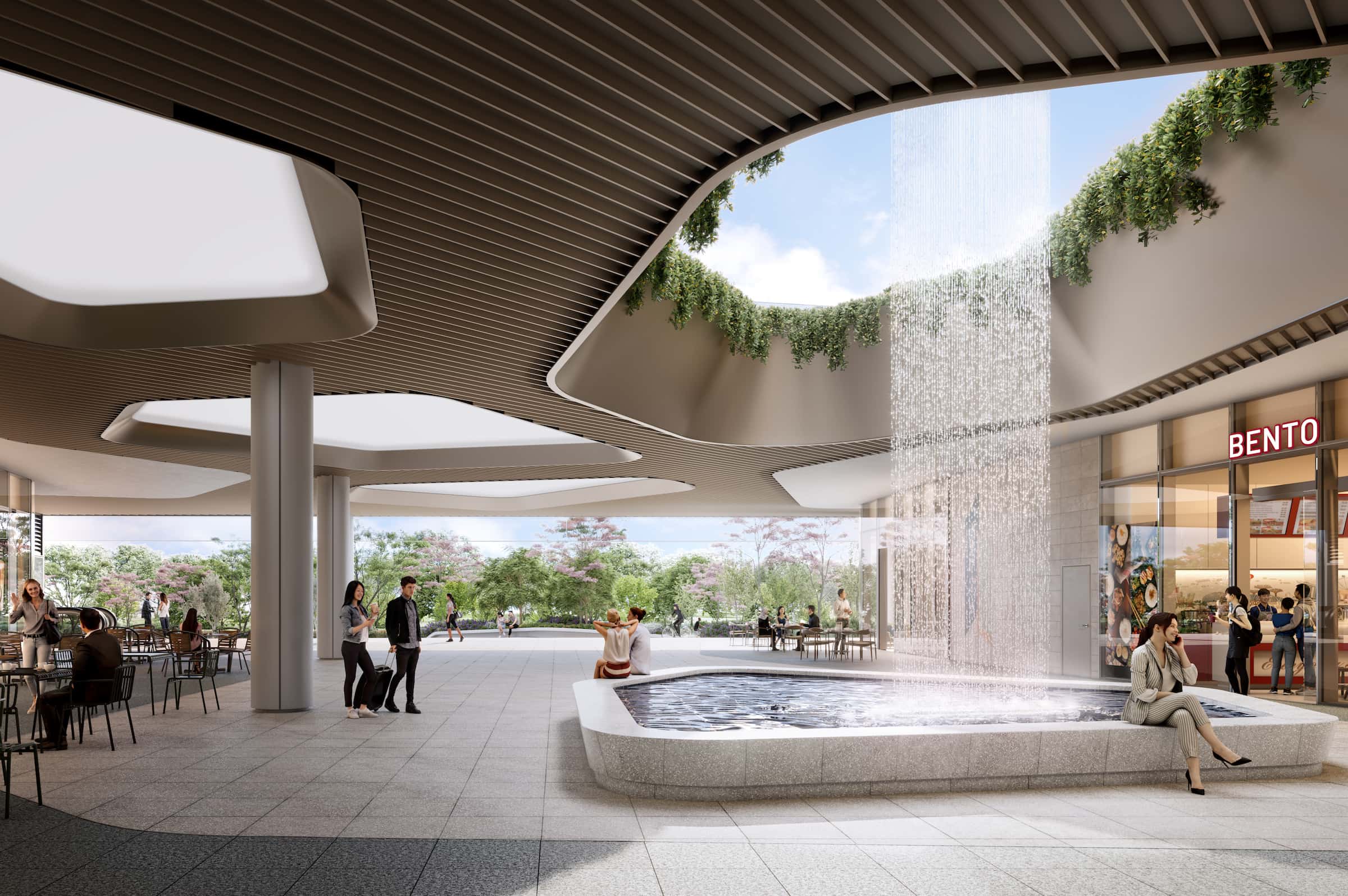 A cascading water feature soothes the senses in the F&B zone of The Courtyard.